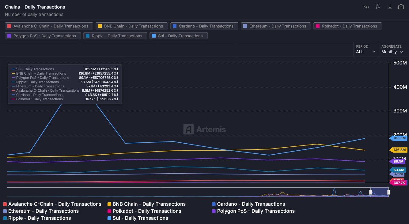 Ngày 3/6/2025, theo biểu đồ Artemis được chia sẻ trên X, Sui (SUI) đạt 185,5 triệu giao dịch, vượt qua BNB Chain với 136,8 triệu giao dịch. Đây là dấu hiệu cho thấy hoạt động mạng lưới Sui ngày càng tăng mạnh trong không gian blockchain layer 1.