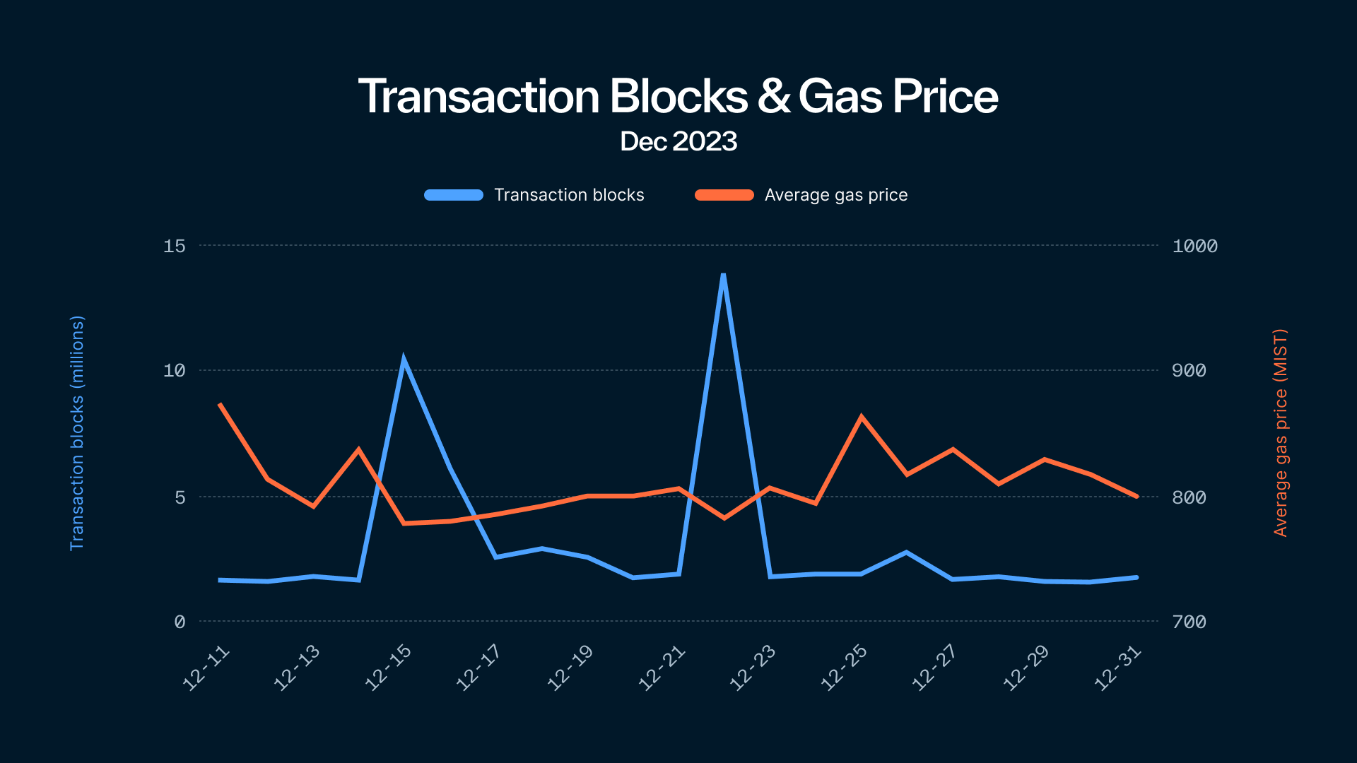 Vào ngày 22 tháng 12, Sui đã tạo ra 13,8 triệu block, với số giao dịch mỗi giây (TPS) đạt mức cao nhất là 6.000. Ngược lại với các layer 1 khác, như Ethereum, giá gas trong giai đoạn lưu lượng truy cập cao này lại giảm, theo một bài đăng trên blog của Sui. Theo Suiexplorer, hiện có 106 trình xác thực vận hành 413 node để bảo mật blockchain Sui.