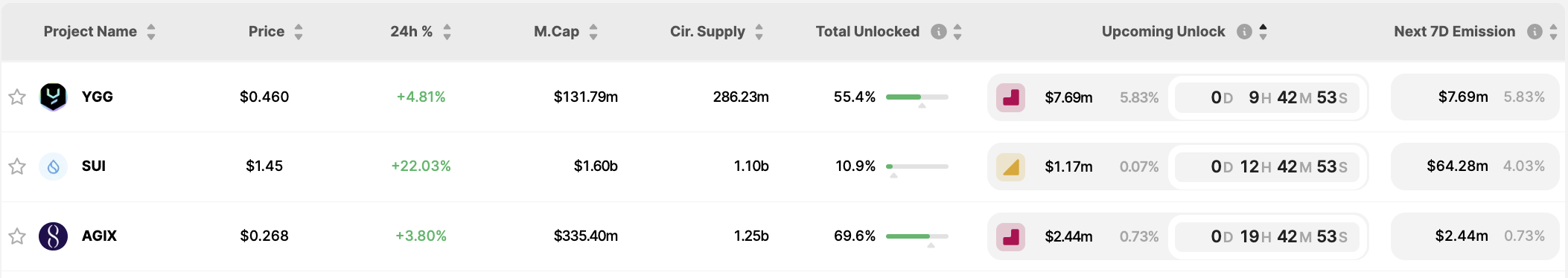 Lịch mở khoá SUI, YGG, AGIX. Nguồn: Token Unlocks