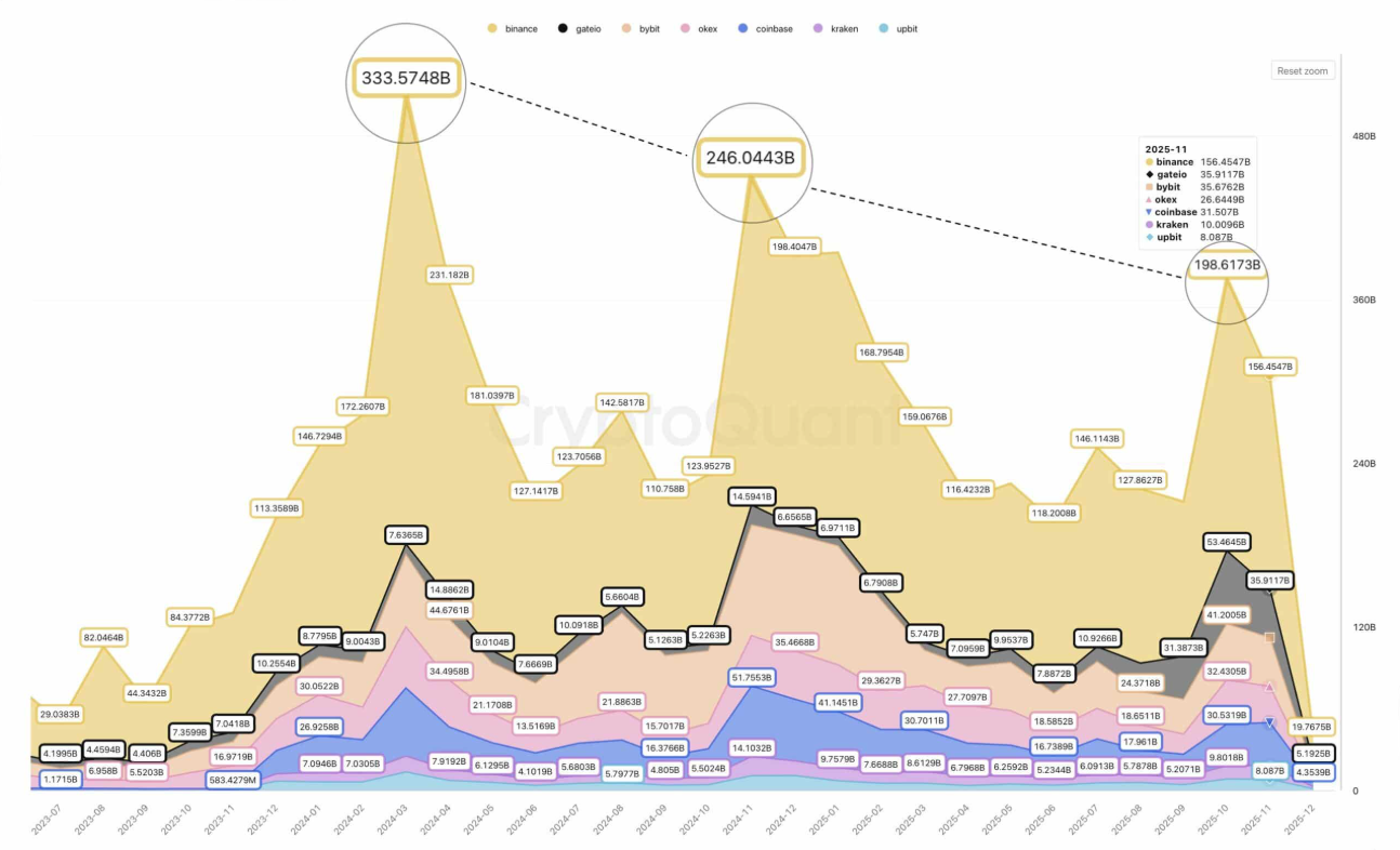 Trong một bài đăng trên X, nhà phân tích Darkfost nhận định rằng khối lượng giao dịch spot trên các sàn lớn đã có dấu hiệu chững lại trong tháng 11. Binance, dù vẫn chiếm lĩnh phần lớn thị phần, chứng kiến khối lượng giao dịch giảm tới 40 tỷ USD so với tháng 10.
