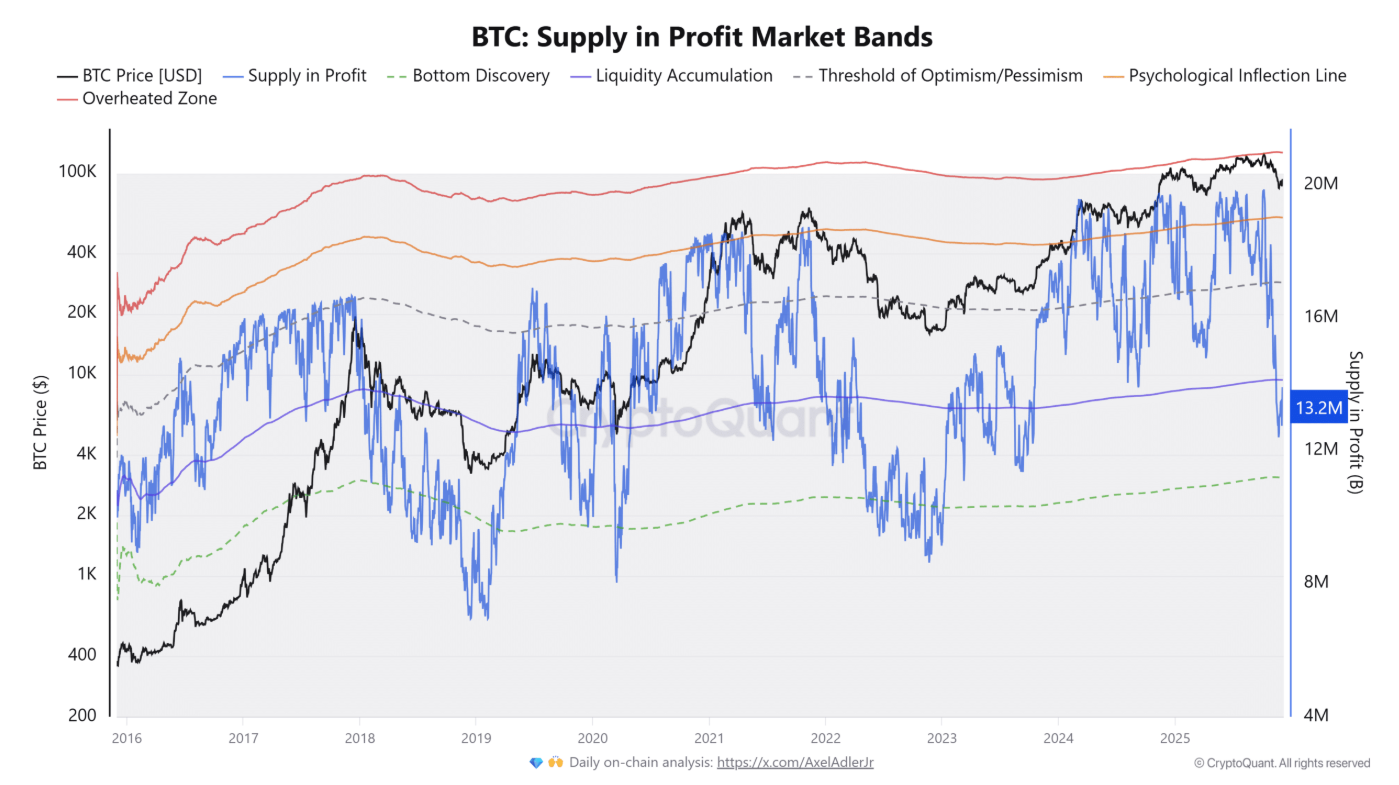 Chỉ số Bitcoin Supply in Profit Market Bands đã giảm mạnh, từ trên đường tâm lý xuống dưới mức tích lũy thanh khoản. Nói một cách đơn giản, nguồn cung đang có lãi từng phản ánh điều kiện thị trường tăng giá, nhưng áp lực bán từ đầu tháng 10 đã xóa sạch lợi nhuận của các holder, đưa chỉ số về mức thấp tương tự tháng 6/2021.