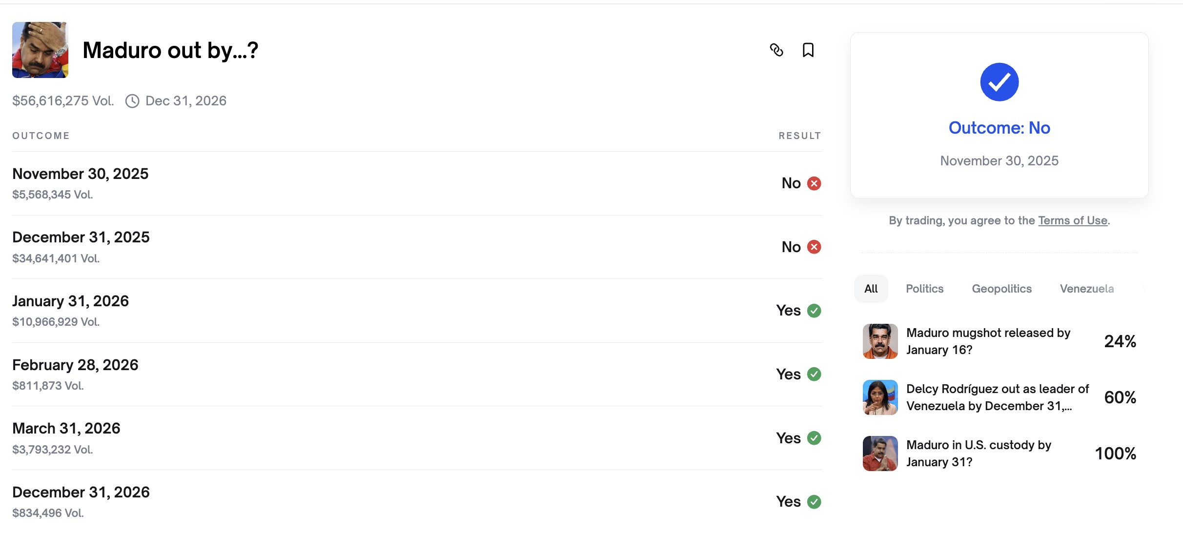 Trên Polymarket, kèo cược rất đơn giản: “Maduro rời quyền lực trước ngày 31/1/2026”.
