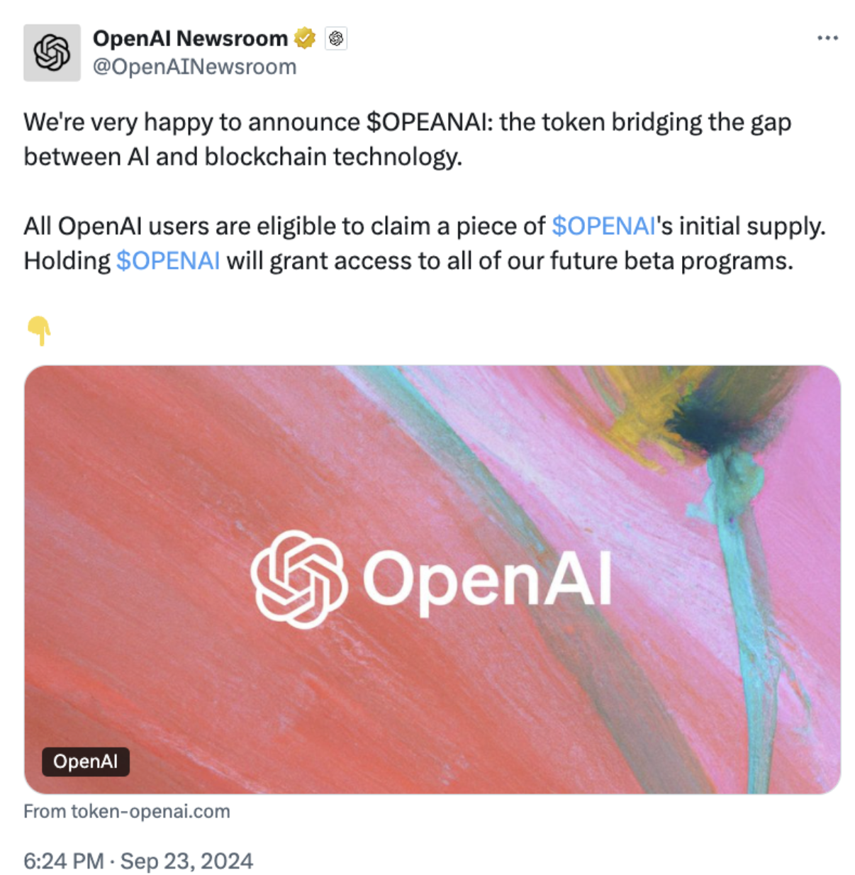 “Chúng tôi rất vui mừng thông báo về OPENAI: cầu nối giữa công nghệ AI và blockchain. Tất cả người dùng OpenAI đều đủ điều kiện để claim một phần nguồn cung ban đầu của OPENAI, và việc nắm giữ token này sẽ cấp quyền truy cập vào tất cả các chương trình beta trong tương lai của chúng tôi.”