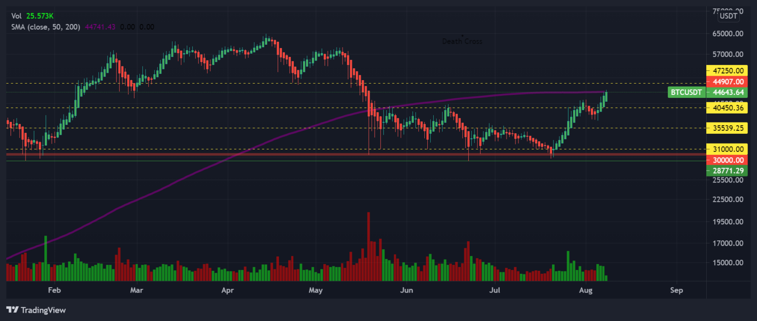 Tăng giá là tâm lý trong ngày khi Bitcoin đã test mốc $45K. Sau một số lần giảm nhẹ từ ngày 2/8 đến 4/8, Bitcoin tăng giá trên biểu đồ hàng tuần, biểu đồ một ngày và biểu đồ 12 giờ. Trong 4 ngày qua, nến giá đã đóng trong màu xanh.