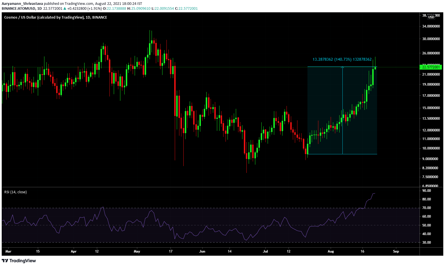 Vào tháng 2, khi các altcoin khác bắt đầu tăng giá, ATOM đã đạt mức ATH. Trong những tháng tiếp theo, cho đến tháng 5, nó hợp nhất quanh phạm vi đó. Mặt khác, sau đợt phục hồi mới nhất, giá tăng 140% lên đến 22,6 đô la.