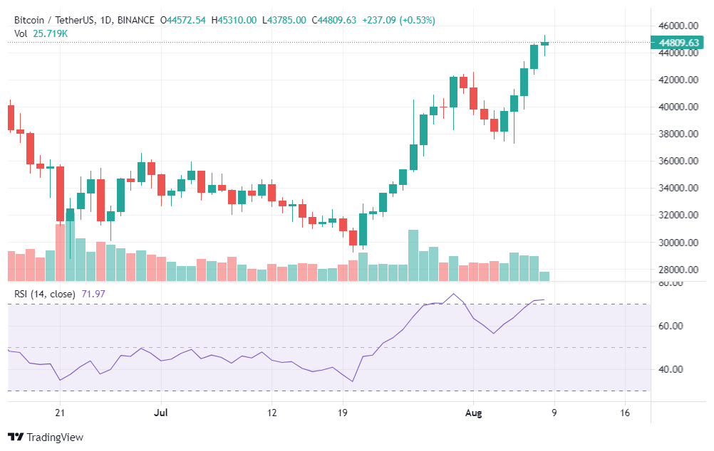 Giá Bitcoin tăng lên mức cao nhất trong nhiều tháng trên 45k đô la vào hôm nay. Thời điểm hiện tại rất thú vị, đặc biệt vì Bitcoin đóng 3 nến đỏ hàng ngày liên tiếp trước ngày 4/8. Trên thực tế, nhiều người coi động thái này là bước đột phá cuối cùng khỏi phạm vi giao dịch mà BTC đã bị mắc kẹt kể từ tháng 5. $ 45.282 là mức cao nhất của BTC kể từ ngày 19/5/2021.