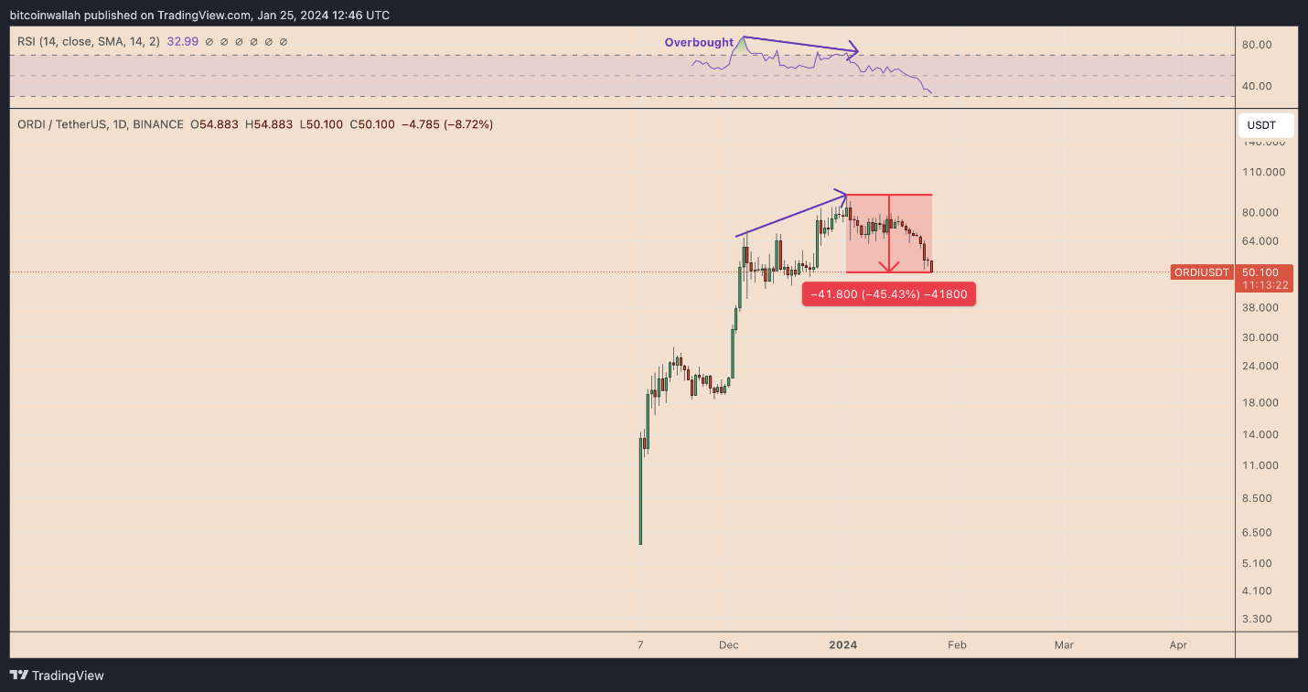 Ví dụ, biểu đồ hàng ngày của ORDI thể hiện mô hình phân kỳ giảm giá cổ điển từ ngày 5/12/2023 đến ngày 2/1/2024. Nói một cách đơn giản, giá của ORDI đang hình thành các đỉnh cao hơn, nhưng chỉ số sức mạnh tương đối (RSI) đang tạo ra đỉnh thấp hơn.