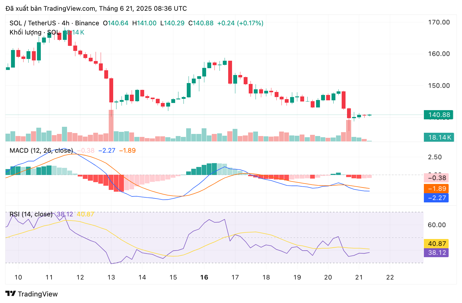 Trên biểu đồ 4 giờ, các chỉ báo kỹ thuật như MACD đang cho thấy sự áp lực giảm rõ rệt (-1,8), trong khi chỉ số RSI đang gần vùng quá bán với giá trị 38, báo hiệu thị trường có thể tiếp tục suy yếu. Mức tiếp theo cần theo dõi là mức đáy ngày 20 tháng 6 tại 136,51 đô la. Nếu giá phá vỡ mức này, có thể dẫn đến một chuỗi lệnh dừng lỗ, đẩy Solana về khu vực 130 đô la.