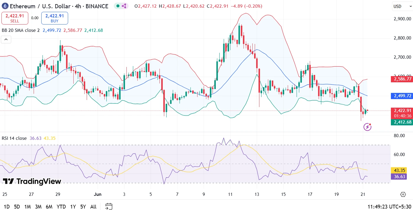 Ethereum hiện đang phải đối mặt với áp lực lớn nhất trong số các đồng tiền điện tử hàng đầu, khi giá của nó giảm 5,3%, xuống còn 2.426 đô la. Khối lượng giao dịch hàng ngày của ETH đã giảm mạnh tới 76%, chỉ còn 20,3 tỷ đô la, với mức thấp nhất trong ngày là 2.371 đô la, cho thấy đồng tiền này đang thử thách một vùng hỗ trợ quan trọng.
