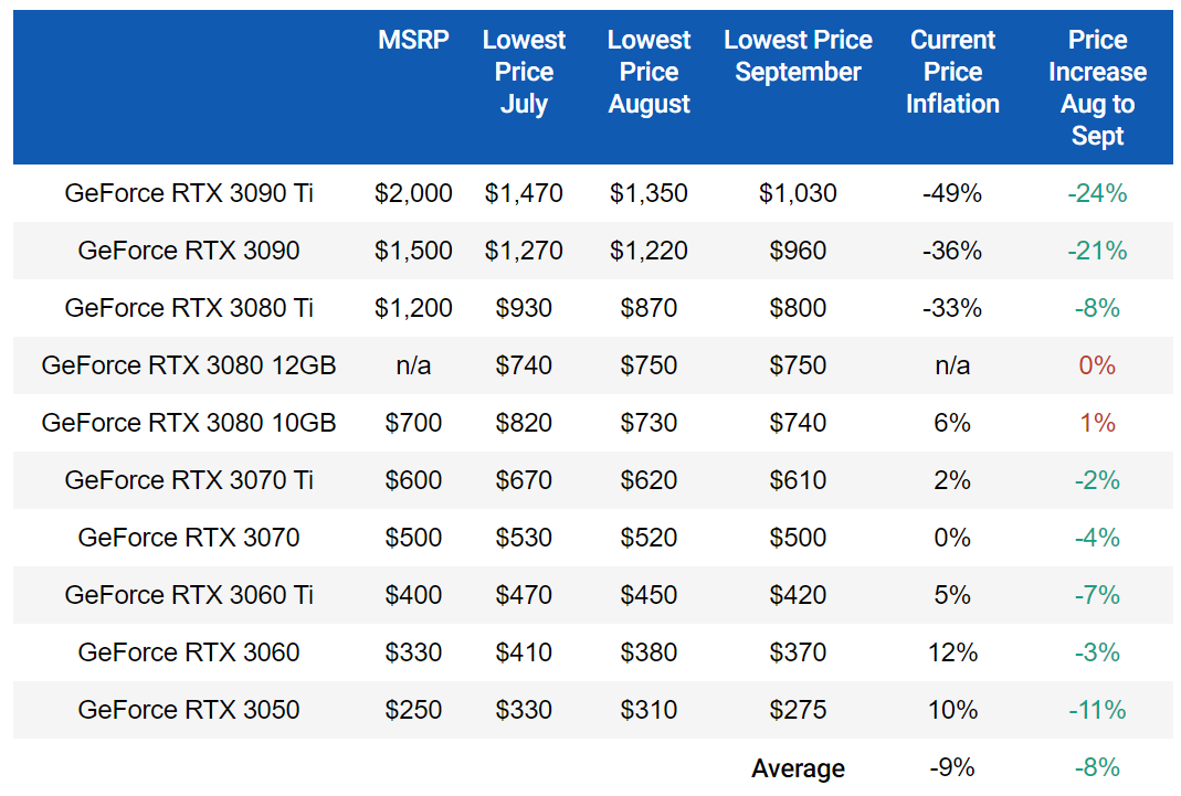 Cập nhật giá GPU kể từ tháng 9/2022 | Nguồn: Techspot