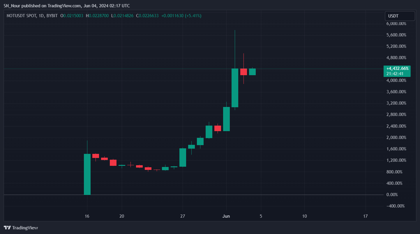 Notcoin đã được niêm yết trên sàn giao dịch Bybit vào ngày 16 tháng 5. Tính ở thời điểm viết bài, NOT đã tăng hơn 4.400% kể từ mức giá được niêm yết.