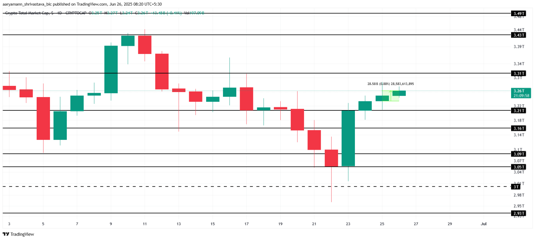 Tổng vốn hóa thị trường tiền điện tử đã tăng thêm 28,5 tỷ USD trong vòng 24 giờ, nâng tổng giá trị lên 3,26 nghìn tỷ USD. Động lực tăng trưởng này phần lớn đến từ sự ổn định trở lại của các thị trường tài chính toàn cầu, qua đó tạo nền tảng tích cực cho đà phục hồi của thị trường tiền điện tử. Nhìn chung, tâm lý nhà đầu tư đang dần cải thiện, phản ánh qua những tín hiệu phục hồi rõ nét trên toàn thị trường.