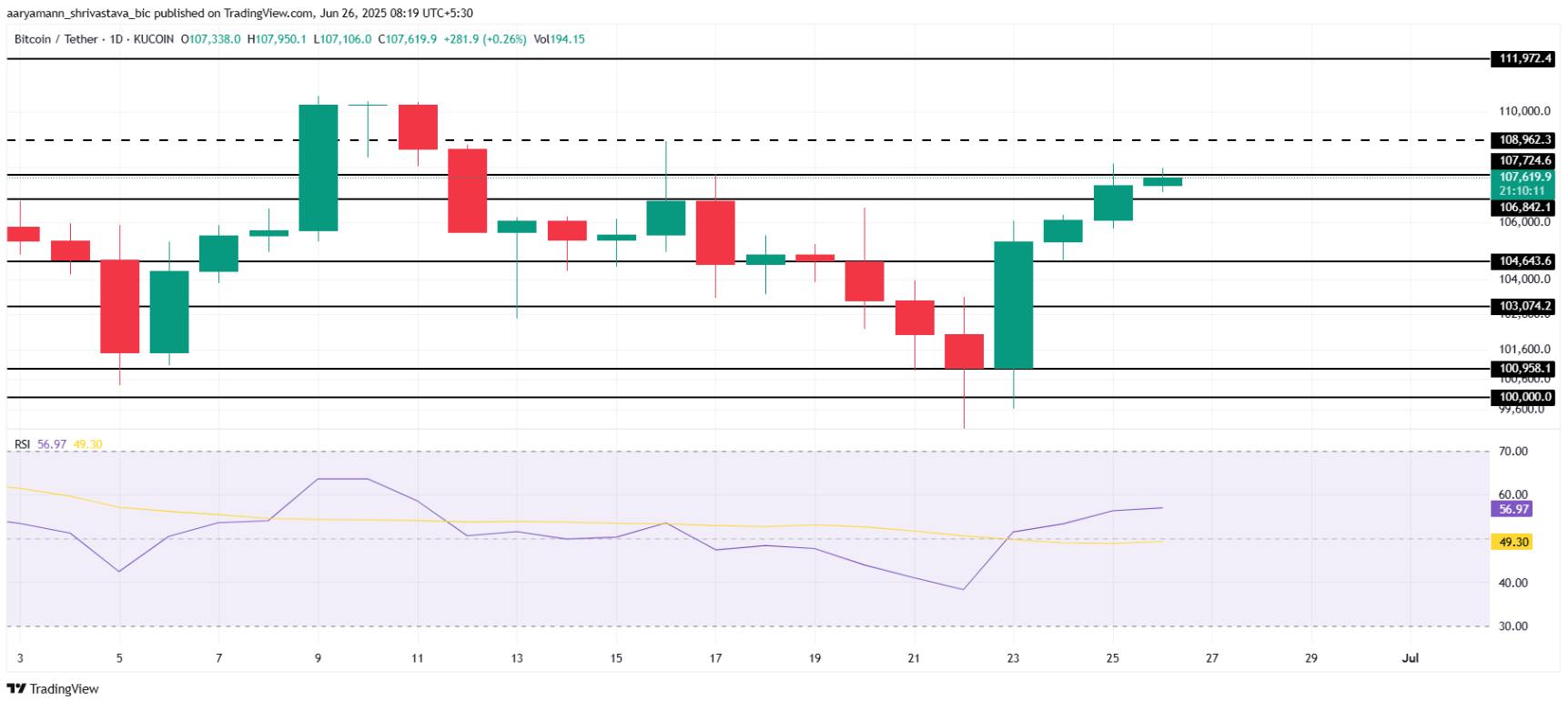 Hiện tại, Bitcoin đang giao dịch quanh mức $107.619, cho thấy nỗ lực duy trì đà phục hồi sau chuỗi biến động gần đây. Ngưỡng $107.724 đang đóng vai trò như một vùng hỗ trợ then chốt – nếu được giữ vững, đây sẽ là bàn đạp quan trọng giúp giá tiếp tục gia tăng trong ngắn hạn.