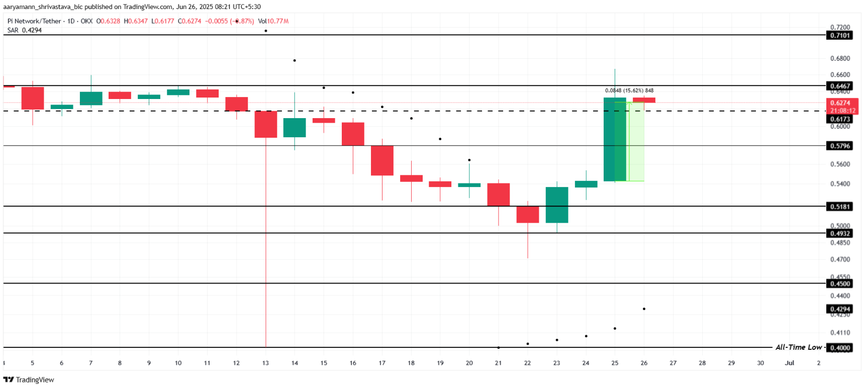 Trên phương diện kỹ thuật, chỉ báo Parabolic SAR hiện đã dịch chuyển xuống dưới các nến giá – một tín hiệu điển hình cho thấy xu hướng tăng đang dần hình thành. Nếu Pi Network có thể bứt phá qua rào cản $0,64 và biến ngưỡng này thành vùng hỗ trợ mới, đà tăng có thể sẽ được củng cố mạnh mẽ, mở ra triển vọng duy trì và mở rộng sóng phục hồi hiện tại.