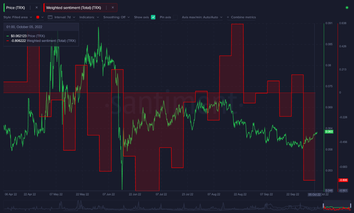 “Hành động giá của Tron đã giống như một chuyến tàu lượn siêu tốc kể từ khi nó gặp sự cố lớn vào giữa tháng 6. Lưu ý rằng 5 tuần sau cú sụt giảm đó, đám đông đã cực kỳ tiêu cực đối với TRX và giá đã phục hồi. Chà, với tình cảm cực kỳ tiêu cực xảy ra một lần nữa, chúng ta có thể thấy một động thái tương tự”.