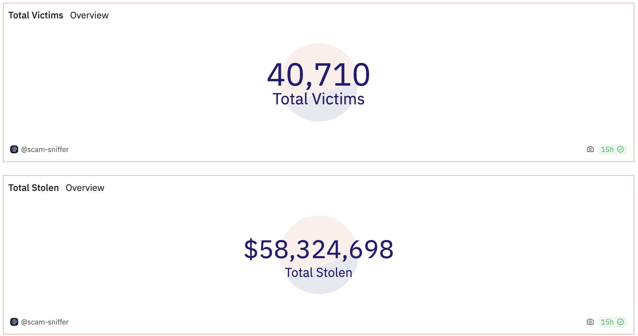 Theo dữ liệu từ công ty bảo mật Scam Sniffer, trong hai tháng đầu năm nay, ước tính có gần 98.000 người dùng bị ảnh hưởng bởi các vụ phishing, đỉnh điểm là khoản thiệt hại khổng lồ 105 triệu USD. Số tiền này bao gồm 58,3 triệu USD bị mất do các sự cố phishing vào tháng 1 và 46,8 triệu USD trong tháng 2.