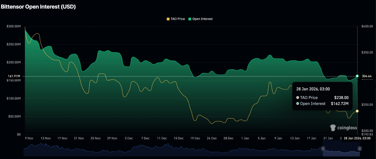 Không chỉ thị trường giao ngay, mảng phái sinh của Bittensor cũng phát đi tín hiệu tích cực. Hợp đồng mở (OI) của hợp đồng tương lai TAO tăng lên 163 triệu USD trong ngày thứ Năm, so với 154 triệu USD một ngày trước đó. Đà gia tăng ổn định của OI phản ánh niềm tin của giới giao dịch đang được củng cố, khi kỳ vọng về khả năng duy trì xu hướng tăng của TAO ngày càng rõ nét.