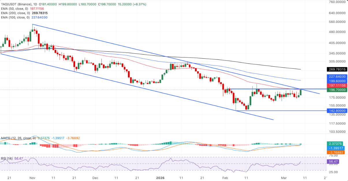 Ở chiều ngược lại, vùng hỗ trợ gần nhất nằm tại 142 USD, tương ứng đáy dao động ngày 6/2. Việc phá vỡ ngưỡng này có thể khiến áp lực bán gia tăng, kéo giá TAO lùi sâu hơn về mốc tâm lý 100 USD.