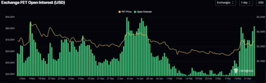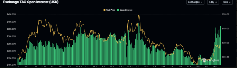 Dữ liệu hợp đồng mở (OI) từ CoinGlass cho thấy TAO và FET ghi nhận mức tăng đáng kể trong ngày thứ Ba, lần lượt đạt 371,49 triệu USD và 82,12 triệu USD. Đáng chú ý, đây là mức OI cao nhất của TAO kể từ đầu tháng 11, trong khi FET cũng chạm đỉnh kể từ giữa tháng 1.