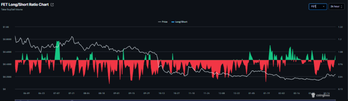 Bên cạnh đó, tỷ lệ long/short của TAO và FET lần lượt ở mức 1,07 và 1,04. Việc duy trì trên ngưỡng 1 cho thấy phần lớn trader đang nghiêng về kịch bản giá tiếp tục đi lên.