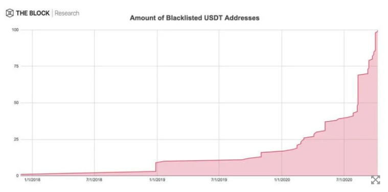Tính đến ngày 9 tháng 7 năm 2020, Tether đã đưa vào danh sách đen 39 địa chỉ Ethereum nắm giữ USDT. Có nhiều lý do khác nhau giải thích tại sao một địa chỉ có thể bị đưa vào danh sách đen, bao gồm các yêu cầu thực thi pháp luật hoặc các hành động đóng băng của Tether là một phần của quá trình khôi phục.