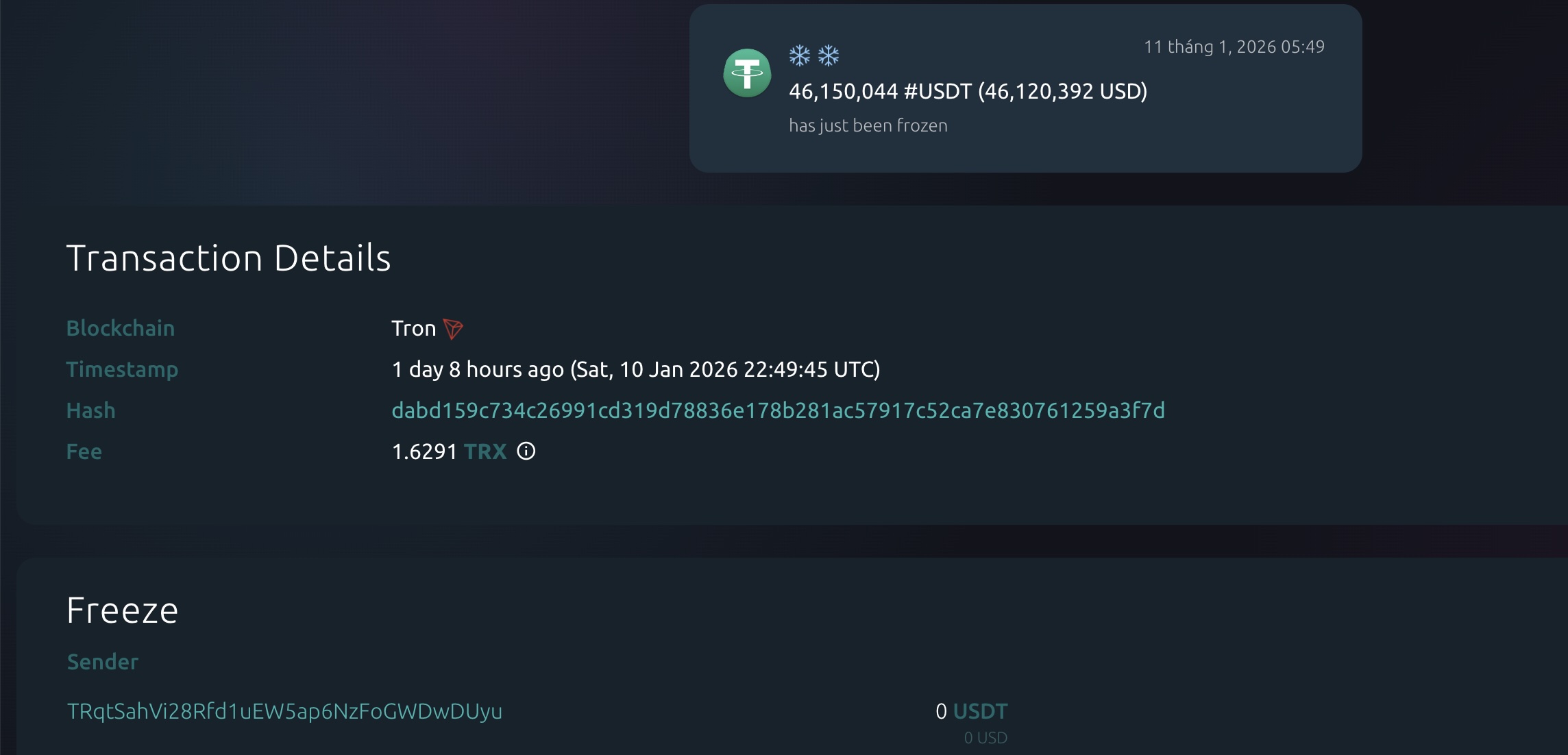Tether đã đóng băng hơn 182 triệu USDT trong vòng 24 giờ qua, nhắm vào năm ví trên mạng Tron, với giá trị mỗi ví dao động từ 12 triệu đến 50 triệu USD; nguyên nhân cụ thể chưa được công bố.