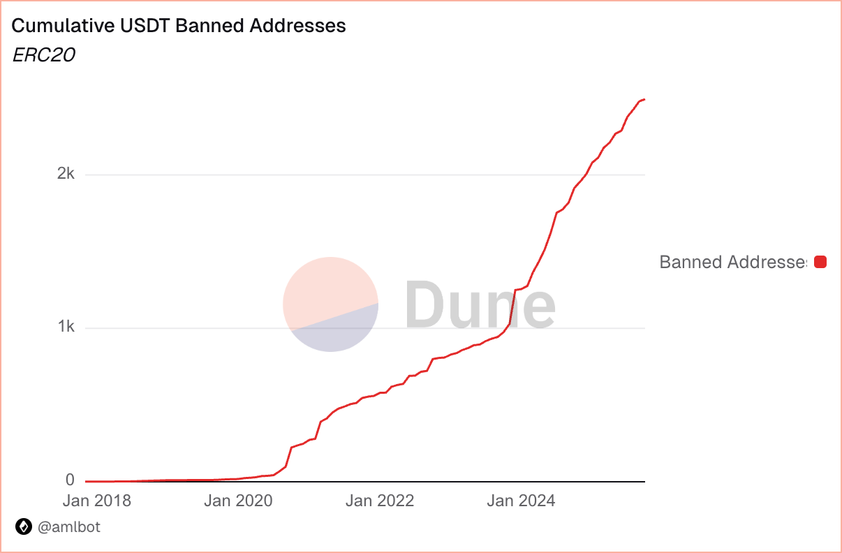 Tether theo đuổi mô hình phối hợp chủ động với cơ quan chức năng, hiện làm việc cùng hơn 275 cơ quan thực thi pháp luật tại 59 khu vực pháp lý. Công ty có thể hạn chế ví không chỉ sau lệnh tòa, mà còn dựa trên các thông báo liên quan tới vụ hack hoặc điều tra đang diễn ra. Tháng 7/2024, tổng giá trị USDT bị đóng băng vượt 130 triệu USD, trong đó có 29,6 triệu USD trên Tron liên quan tới Huione Group của Campuchia đang bị trừng phạt.