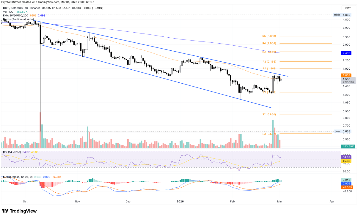 Polkadot ghi nhận mức tăng khoảng 3% tại thời điểm viết bài vào thứ Hai, đánh dấu nhịp hồi phục đáng chú ý sau khi mất gần 8% trong phiên trước đó. Hiện tại, DOT đang dao động quanh đường EMA 50 ngày tại vùng 1,603 USD, đồng thời áp sát đường xu hướng giảm nối các đỉnh ngày 6/10 và 13/1. Cấu trúc này nằm trong mô hình cái nêm mở rộng giảm dần trên khung thời gian lớn hơn, cho thấy thị trường vẫn đang trong giai đoạn giằng co.