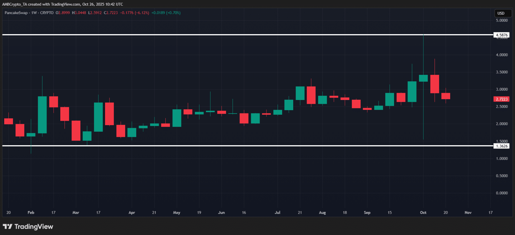 Hiện tại, CAKE đang tiến sát vùng hỗ trợ then chốt 2,50 USD – mức giá đã được giữ vững suốt từ tháng 3. Trong quá khứ, mỗi lần chạm ngưỡng này, giá thường bật tăng mạnh, song các nhịp phục hồi gần đây lại thiếu lực và nhanh chóng suy yếu.
