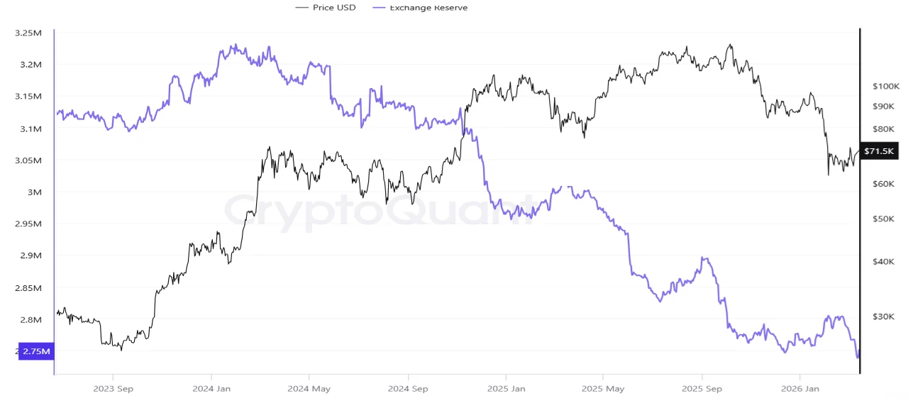 Song song đó, dữ liệu từ nền tảng phân tích crypto Cryptoquant cũng cho thấy xu hướng tương tự đối với dự trữ bitcoin trên sàn trong những năm gần đây. Tổng lượng BTC trên các sàn đã giảm từ hơn 3,2 triệu BTC trong năm 2024 xuống còn khoảng 2,73 triệu BTC vào tháng 3/2026. Trong cùng giai đoạn, giá bitcoin dao động quanh mức 70.500 USD, phản ánh nhiều chu kỳ biến động của thị trường từ năm 2022 đến nay.