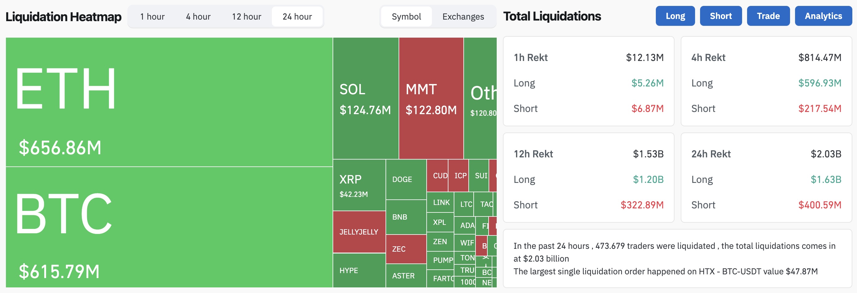 Theo dữ liệu từ CoinGlass, tổng cộng 2,03 tỷ USD vị thế giao dịch đã bị thanh lý trong 24 giờ qua, trong đó 1,63 tỷ USD đến từ các vị thế Long – tức là các lệnh đặt cược giá tăng.