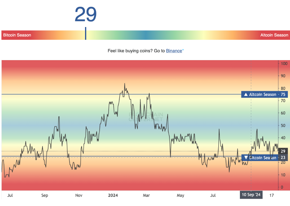 Dữ liệu từ Blockchain Center cho thấy chỉ có 29% trong số 50 altcoin hàng đầu vượt trội hơn BTC trong ba tháng qua, còn cách xa ngưỡng 75% để được công nhận là “mùa altcoin” chính thức.
