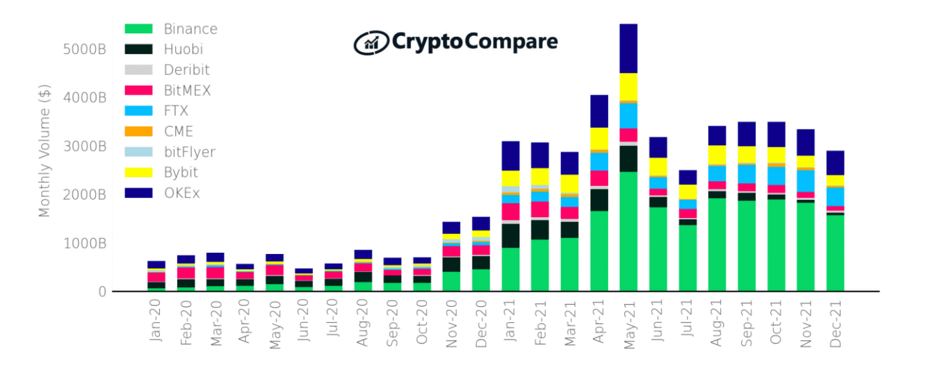 Sàn giao dịch Binance thống trị thị trường phái sinh vào tháng 1, chiếm 51,6% tổng khối lượng. Tiếp theo là OKEx (19,6%) và FTX (12,1%).