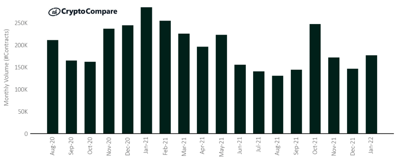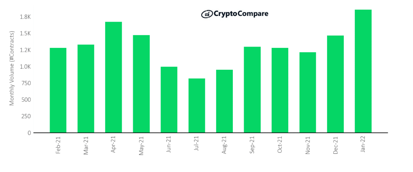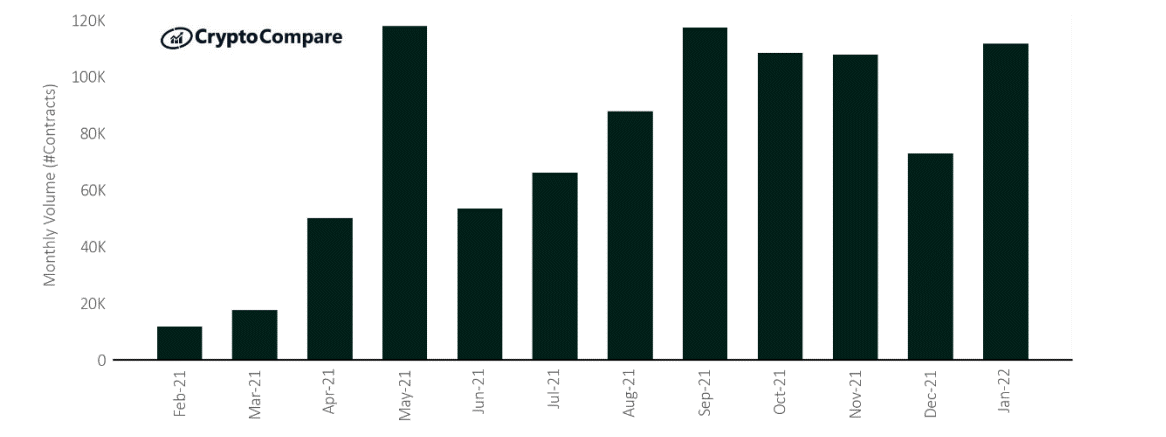 Hợp đồng tương lai BTC trên CME: Khối lượng hàng tháng | Nguồn: CryptoCompare