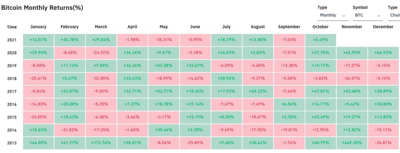 Dữ liệu của Bybt cho thấy Bitcoin kết thúc tháng 10 trong màu xanh phần lớn thời gian kể từ năm 2013 – với tỷ lệ thành công hơn 77%. Năm ngoái, tiền điện tử hàng đầu đã tăng 28% và đạt trên 13.500 đô la sau khi kết thúc tháng 9 ở mức khoảng 10.800 đô la (lỗ 7,5%).