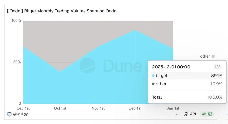 Trong khi đó, Bitget tăng trưởng nhanh nhờ hợp tác với Ondo Finance để niêm yết cổ phiếu và ETF token hóa phát hành qua nền tảng Ondo Global Markets. Tổng khối lượng giao dịch tích lũy đã tiệm cận 1 tỷ USD, riêng tháng 11 Bitget chiếm khoảng 89% khối lượng giao dịch toàn cầu đối với cổ phiếu token hóa do Ondo phát hành. Về mặt phát hành, Ondo hiện đã vượt xStocks để trở thành đơn vị chiếm thị phần lớn nhất về tổng giá trị cổ phiếu token hóa lưu hành onchain.