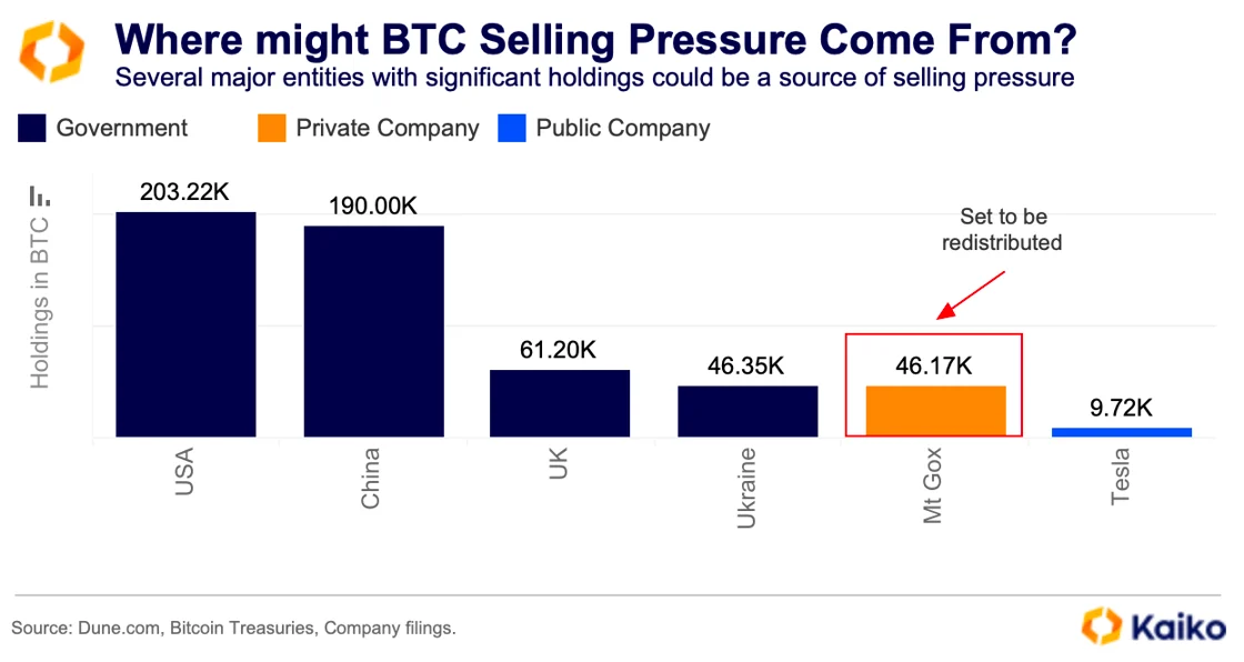 Ngoài 2,72 tỷ USD mà Mt. Gox còn lại để tái phân phối, còn có nhiều chủ sở hữu lớn khác có thể là nguồn gây áp lực bán trong những tháng tới. Điều này bao gồm chính phủ Hoa Kỳ với khối lượng nắm giữ hơn 200.000 BTC, cũng như các chính phủ khác như Anh, Trung Quốc và Ukraine. Tesla, công ty chưa mua hoặc bán BTC kể từ năm 2022, cũng có thể cân nhắc bán một phần lượng BTC nắm giữ trong tương lai để tài trợ cho các dự án mới.