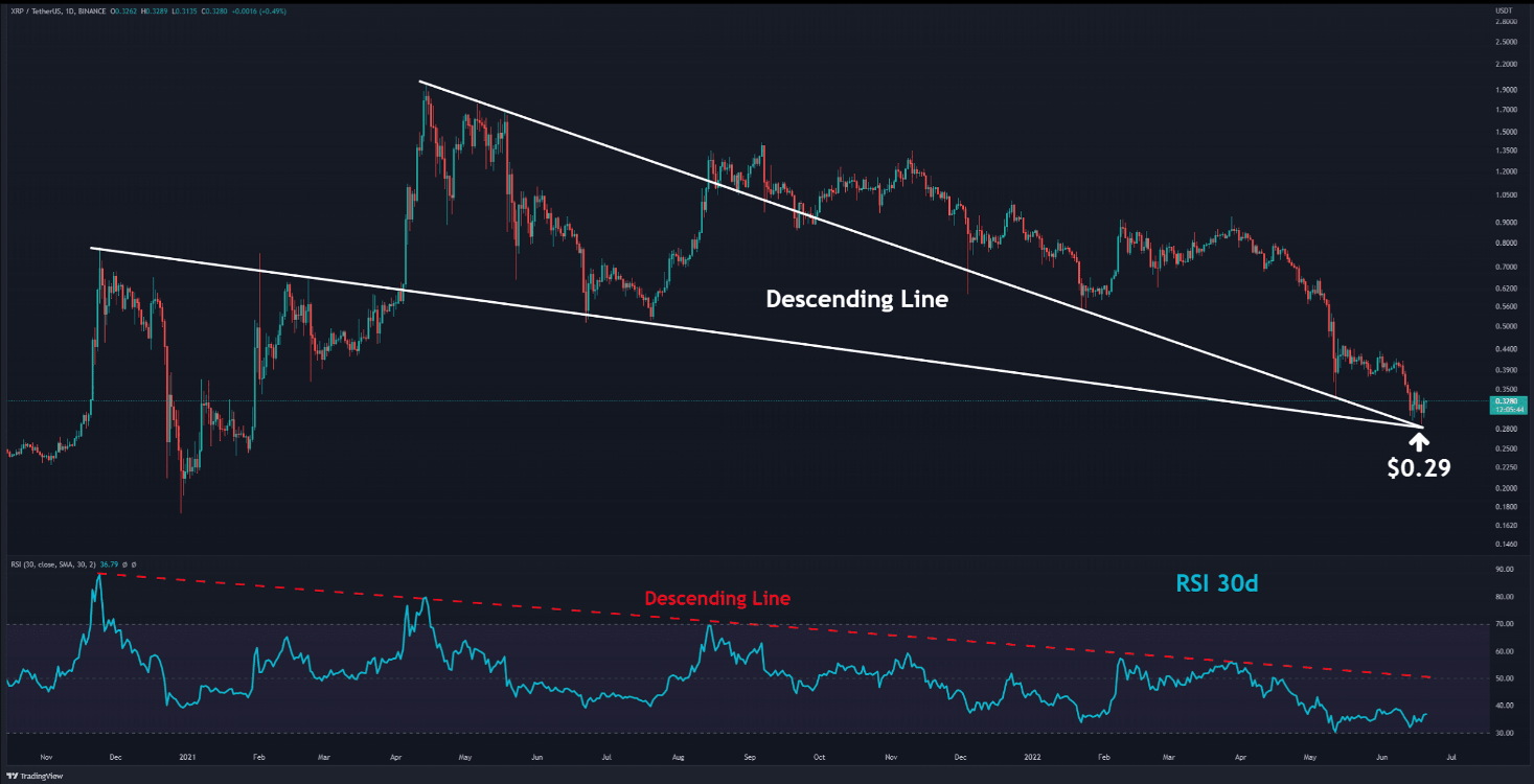 Trên khung thời gian hàng ngày, XRP đang bước vào tuần thứ hai giao dịch trên ngưỡng hỗ trợ ngang ở $ 0,3. Mức này được củng cố bởi hai đường giảm dần (màu trắng), đã tồn tại trong hơn một năm. Chỉ báo RSI 30D cũng đã tiến gần đến vùng quá bán, mức thấp nhất kể từ tháng 4 năm 2018.