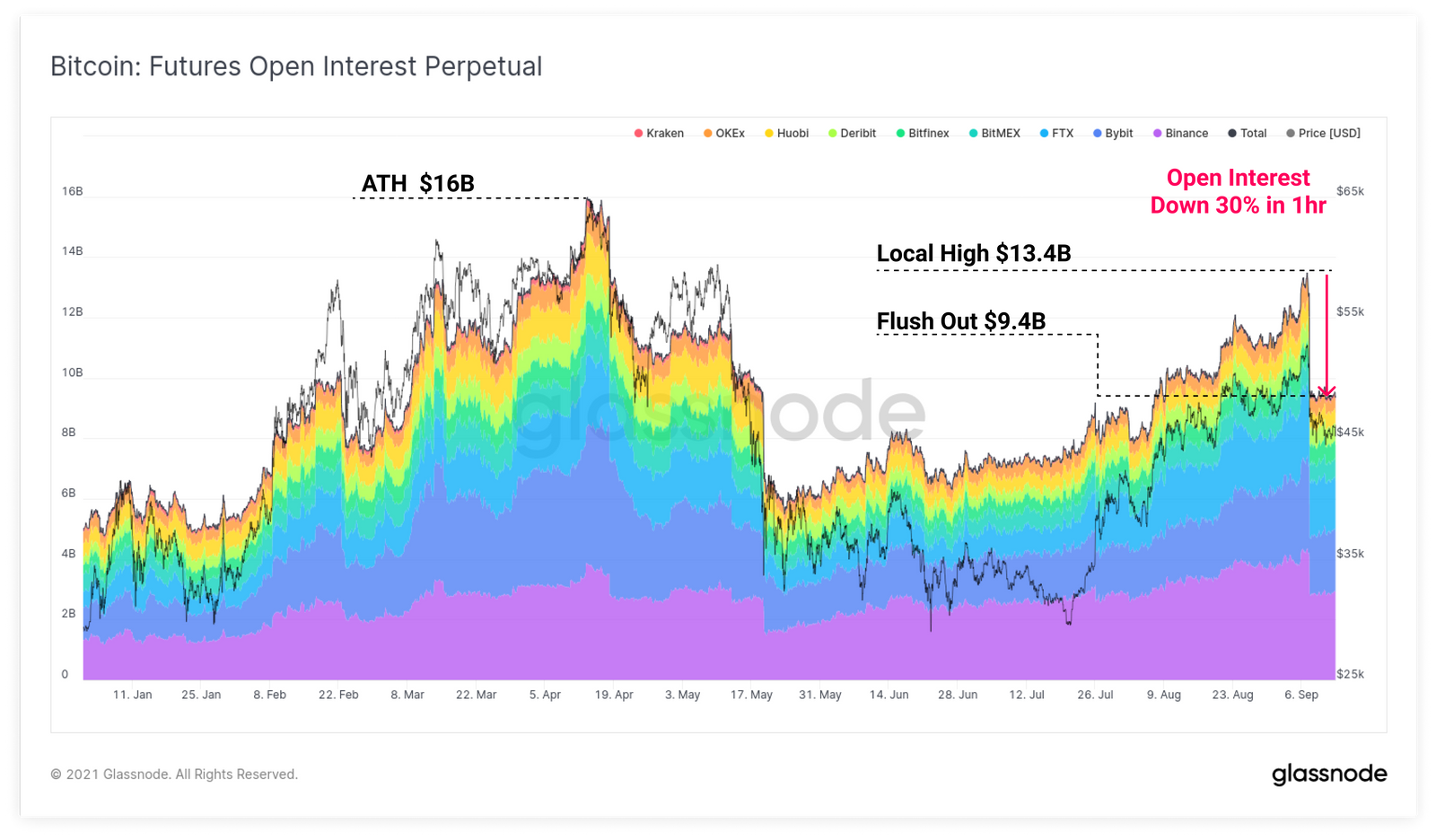 Điều này cũng góp phần làm cho hợp đồng mở (OI) của thị trường hợp đồng tương lai vĩnh viễn giảm hơn 30% khi các hợp đồng trị giá 4 tỷ đô la bị đóng sau 1 giờ. Tại thời điểm viết bài, OI ở mức khoảng 9 tỷ đô la, giảm từ 13 tỷ đô la.