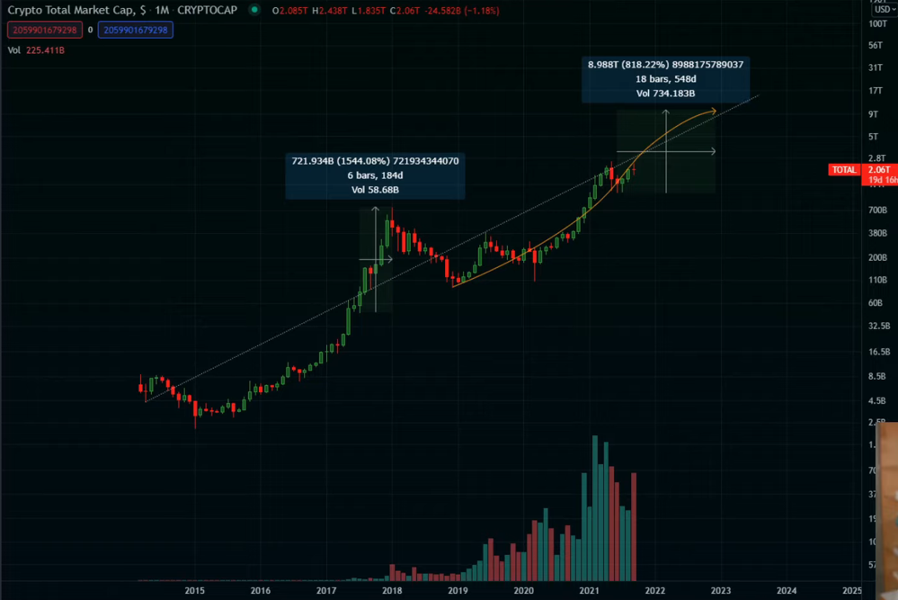 Tổng vốn hóa thị trường đạt mức 2,12 nghìn tỷ đô la tại thời điểm viết bài. Nếu thị phần của Bitcoin trong không gian không đổi, thì mức tăng gấp 5 lần sẽ đưa giá lên trên 200.000 đô la vào cuối năm tới.