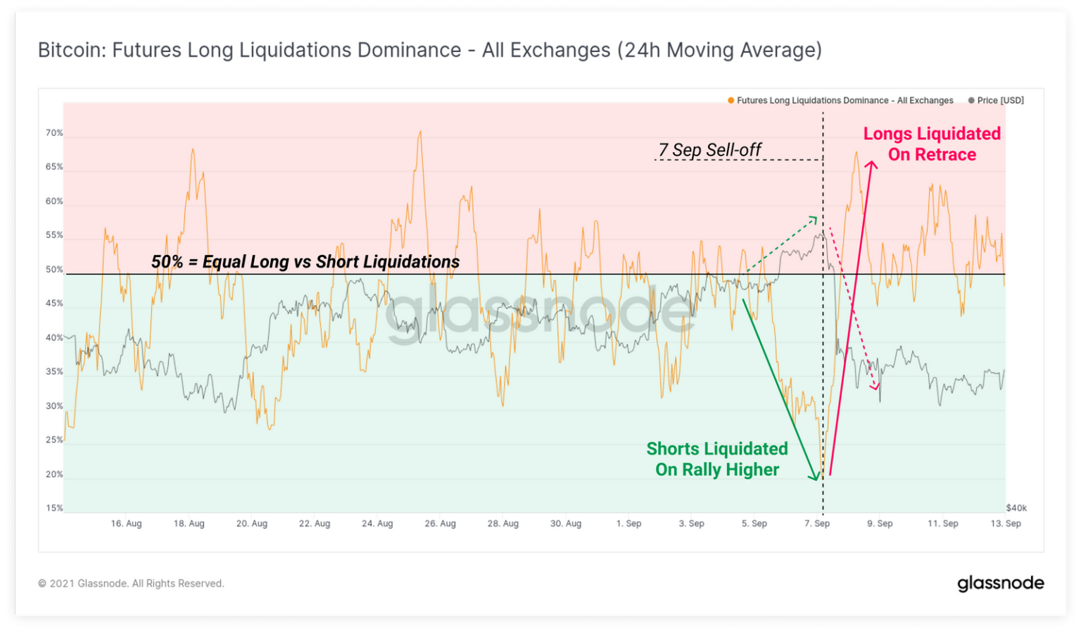 Theo tỷ lệ thống trị của thanh lý long, ngay trước đợt bán tháo, thị trường đã trải qua đợt nén thanh lý short. Đợt nén này chiếm 80% tổng lệnh thanh lý trong khoảng thời gian đó.