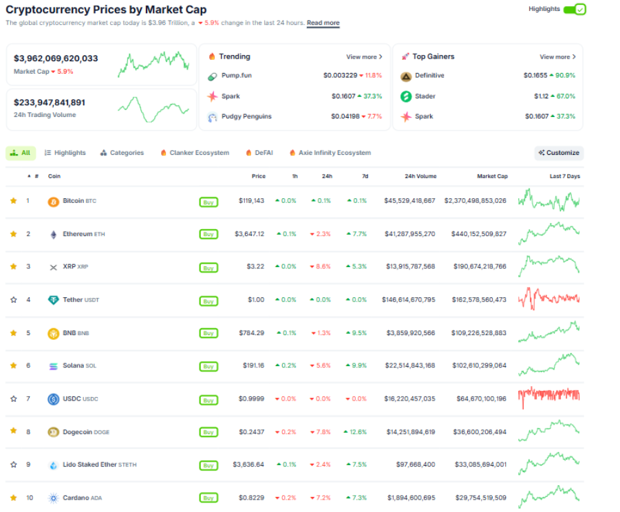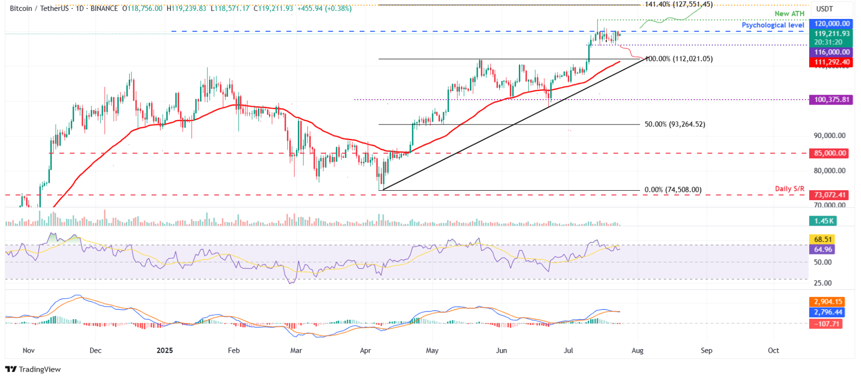 Hiện tại, BTC đang giao dịch trong vùng tích lũy quan trọng, dao động giữa khoảng $116.000 và $120.000, sau khi thiết lập đỉnh lịch sử mới tại $123.218 vào ngày 14/7. Trong phiên thứ Tư, giá đã một lần nữa tiếp cận vùng kháng cự $120.000 nhưng bị từ chối nhẹ, đóng cửa ở mức $118.755. Sang thứ Năm, BTC ghi nhận nhịp hồi nhẹ, giao dịch quanh mốc $119.200.