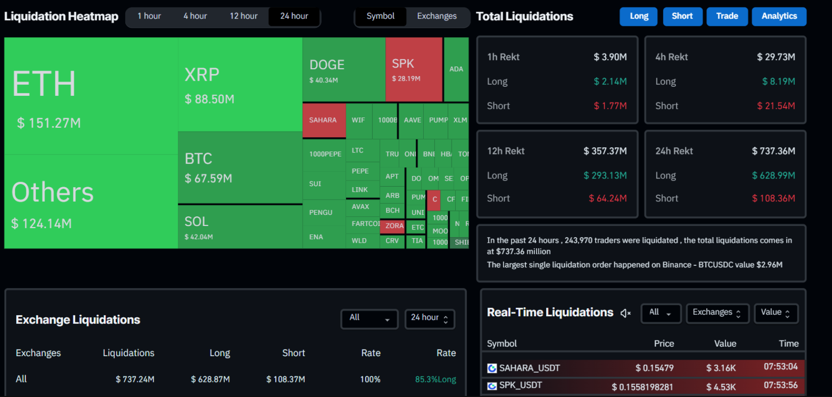 Trong 24 giờ qua, thị trường tiền điện tử đã chứng kiến một đợt bán tháo dữ dội, kéo theo làn sóng thanh lý hàng loạt các vị thế sử dụng đòn bẩy. Tổng giá trị các lệnh bị thanh lý vượt mốc 737 triệu USD, với 85,3% là các vị thế mua (Long) — cho thấy tâm lý lạc quan quá mức đang bao trùm thị trường. Các altcoin hàng đầu như Ethereum (ETH), Ripple (XRP) và Solana (SOL) đều chịu áp lực điều chỉnh mạnh, trong khi nhóm meme coin còn ghi nhận mức giảm sâu hơn nữa. Trước biến động này, giới đầu tư đang dồn sự chú ý vào các vùng hỗ trợ kỹ thuật quan trọng để xác định liệu đây chỉ là một cú “shakeout” ngắn hạn hay là dấu hiệu mở đầu cho một chu kỳ điều chỉnh sâu hơn.