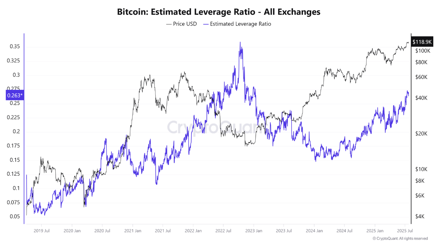 Về mặt kỹ thuật, theo dữ liệu từ CryptoQuant, chỉ số Tỷ lệ đòn bẩy ước tính (Estimated Leverage Ratio – ELR) của BTC đang ở mức 0,263 trong chiều thứ Năm. Điều này cho thấy thị trường hiện vẫn duy trì mức đòn bẩy trung bình, chưa có dấu hiệu quá nóng hay rủi ro cực đoan.