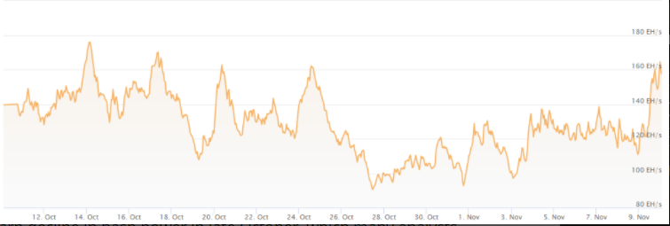 Mức tăng đột biến này diễn ra sau sự sụt giảm mạnh về sức mạnh băm vào cuối tháng 10, mà nhiều nhà phân tích cho rằng các thợ mỏ ở Tứ Xuyên, Trung Quốc đã rời đi sau khi mùa mưa kết thúc.