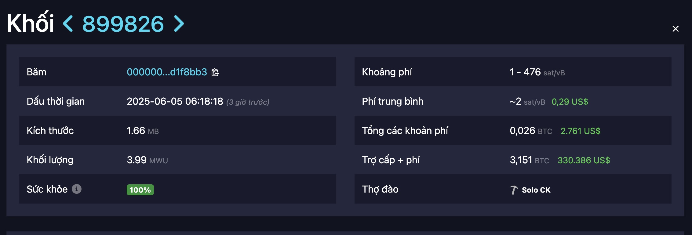 Vào lúc 04:48 ngày 5/6, thợ đào cá nhân “Solo CK” đã khai thác thành công block Bitcoin #899826, nhận thưởng 3,151 BTC (trị giá khoảng 330.386 USD), bao gồm 0,026 BTC (2.761 USD) phí giao dịch. Block có kích thước 1,66 MB.