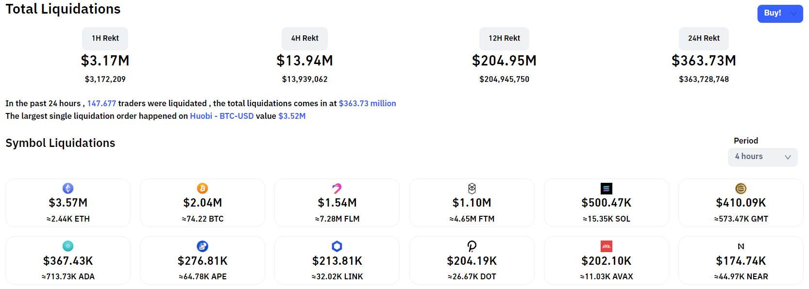 Tổng thanh lý tăng vọt vào ngày 10/6 khi thị trường rộng lớn phản ứng với số liệu lạm phát mới của Hoa Kỳ. Đến hôm nay, con số này vẫn không ngừng tăng lên và vào thời điểm viết bài, 363,7 triệu đô la đã bị thanh lý trong 14h qua, theo Coinglass.