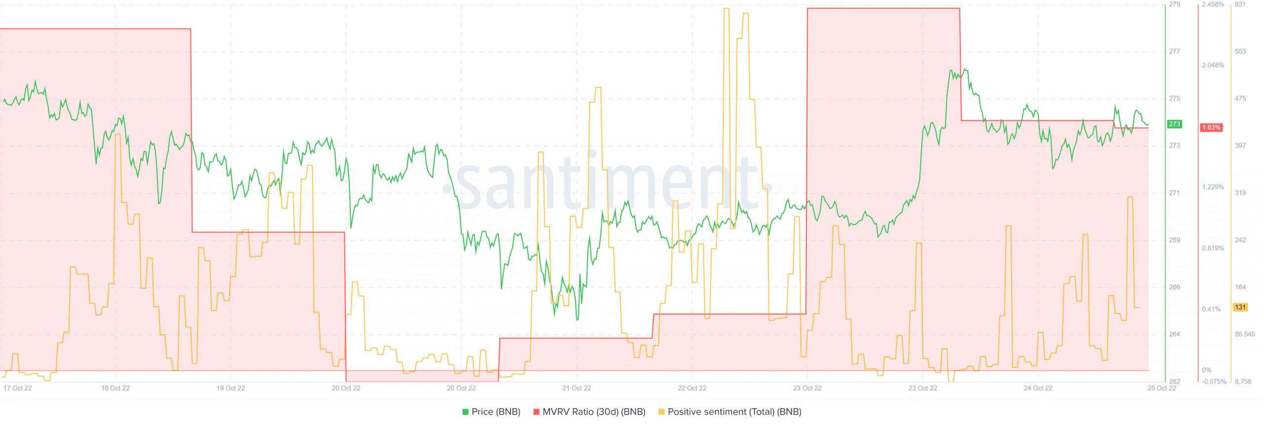 Ví dụ, tỷ lệ MVRV của BNB đã tăng nhưng sau đó giảm vào ngày 24/10. Nó có thể được coi là tín hiệu bi quan báo trước sụt giảm dự kiến. Không chỉ điều này, chỉ số tâm lý tích cực của BNB sau khi tăng vào tuần trước cũng trượt trở lại.