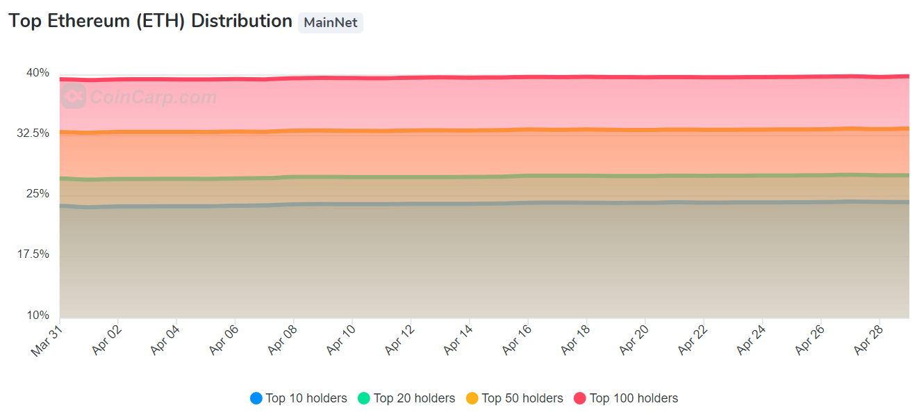 Vốn hoá thị trường Ethereum rơi vào khoảng 351 tỷ USD, đại diện cho 18,3% trong tổng giá trị ròng 1,89 tỷ USD của nền kinh tế tiền điện tử. Sau gần bảy năm hoạt động, 100 địa chỉ ETH giàu nhất chiếm 39,81% tổng cung lưu hành. Tuy nhiên, nếu trừ đi địa chỉ Hợp đồng Ethereum 2.0 – hiện nắm giữ 10,06% tổng cung ETH đang lưu hành – thì 99 địa chỉ giàu có còn lại kiểm soát 29,75%.