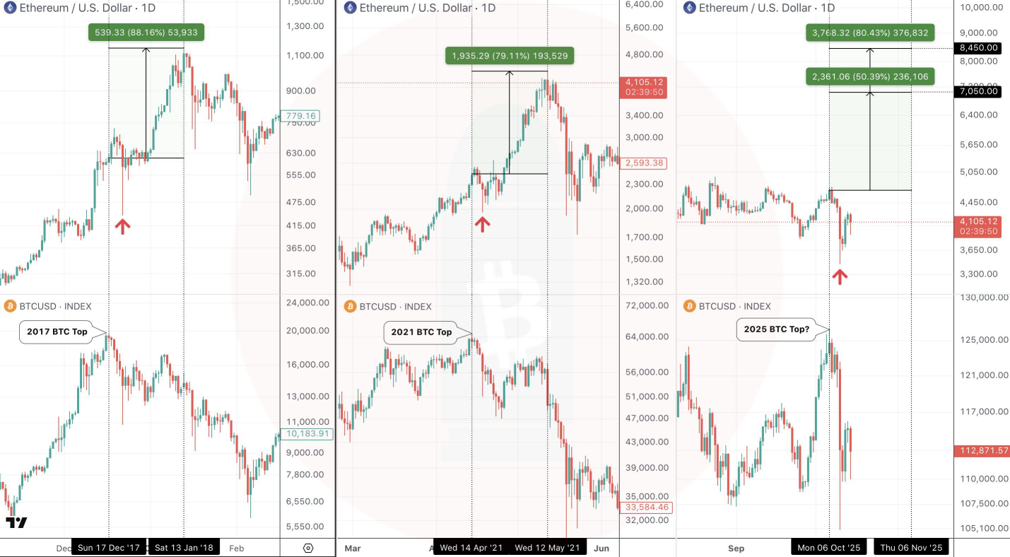 Tuy vậy, không phải ai cũng đồng tình với quan điểm rằng Bitcoin phải dẫn đầu. Nhà phân tích CryptoBullet phản biện rằng trong quá khứ, ETH từng tăng 88% vào tháng 12/2017 và 79% vào tháng 4/2021, ngay sau khi BTC lập đỉnh — minh chứng rằng Ethereum có thể tự tạo động lực tăng trưởng, không cần phụ thuộc vào sức bật của Bitcoin.